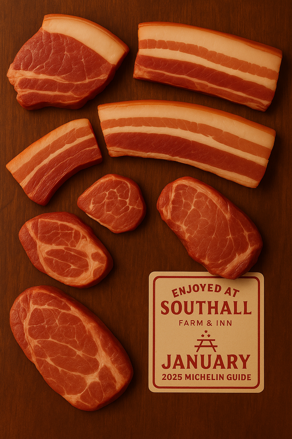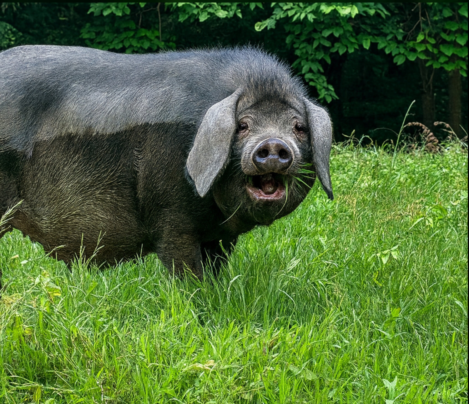 It all starts with our herd of rare heritage Meishan hogs in Maury County, Tenn. Their natural marbling, tenderness, and calm temperament create extraordinary flavor without forcing anything unnatural. These pigs thrive on open pasture and forest, living slowly and eating well — the way hogs were always meant to live.